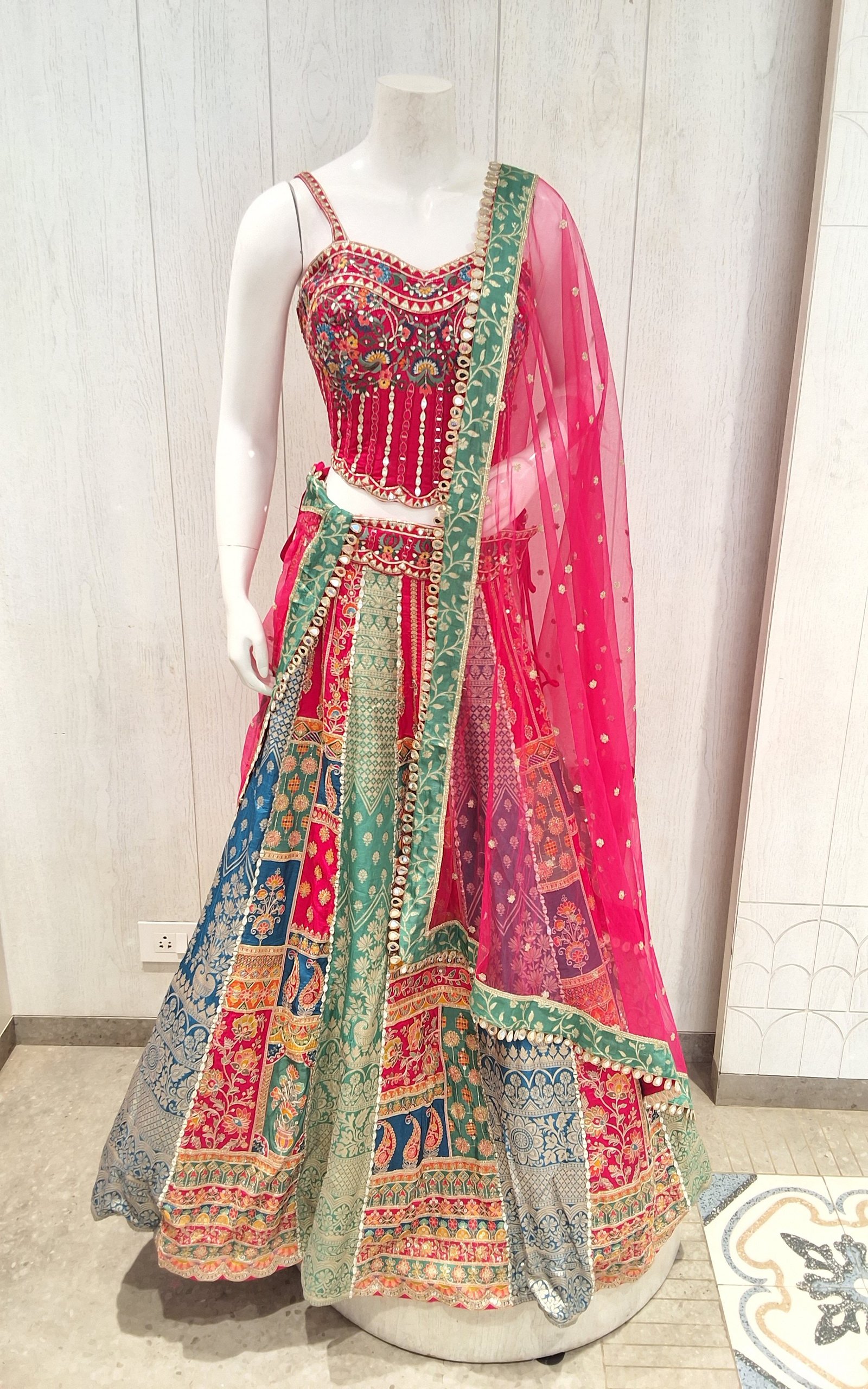 • Lehenga: Paneled A-line featuring diverse patterns and colors with a scalloped mirror-work border.